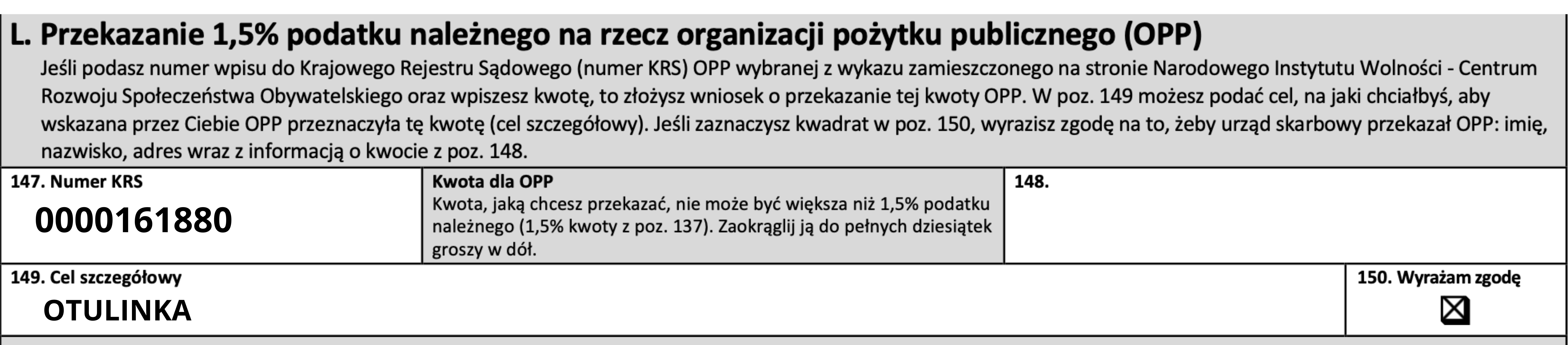 Aby Państwa wsparcie trafiło do małych wojowników z Otulinki, wystarczy w odpowiednim miejscu deklaracji wpisać te dwa kluczowe parametry: